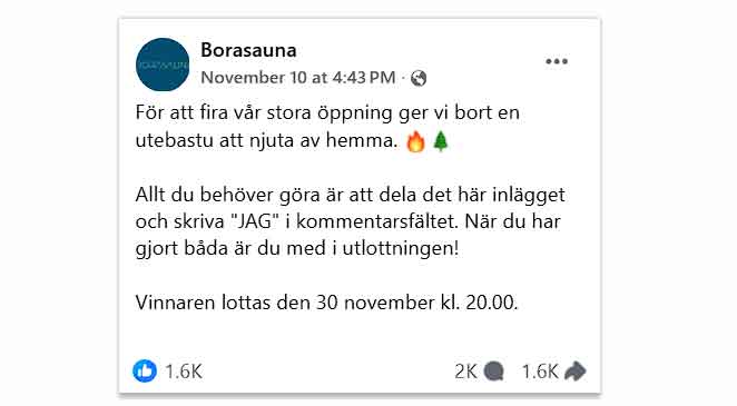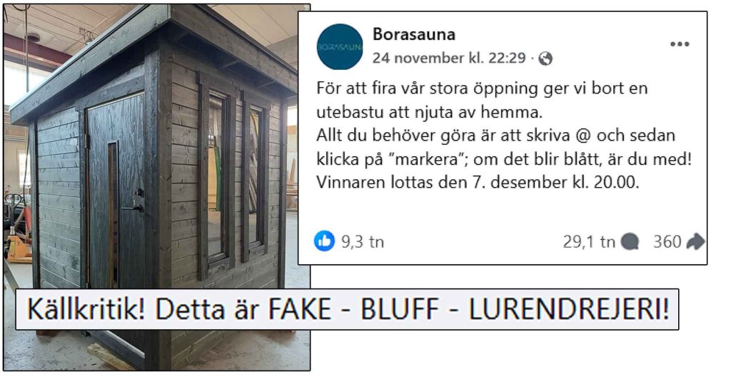 Under hösten har ett par Facebook-sidor spridit fejkade utlottningar med fina priser, där människor uppmanas att skriva i kommentarsfältet för att få delta. Det verkliga syftet är att inläggen ska uppfattas som intressanta av algoritmen som styr vad som syns i allas flöden och därmed visas för fler Facebook-användare.
