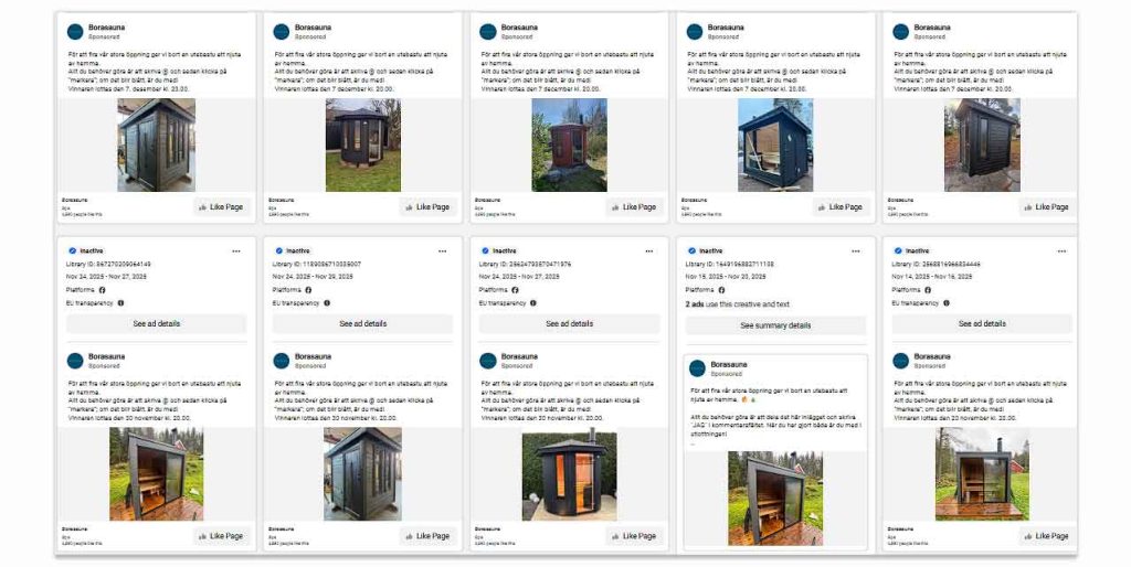 Man kan misstänka att Borasauna inte är den enda Facebook-sidan som bedragarna använder sig av. Testa att söka på ett par ord ur annonserna.