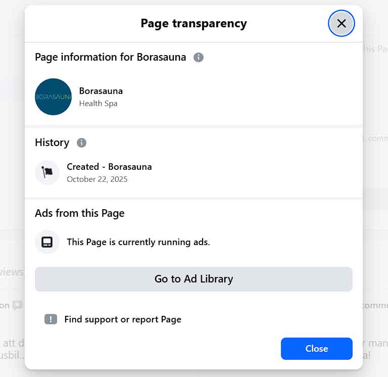 Om du ser en bild eller ett inlägg i flödet, gå in på sidan och undersök den. I Borasaunas fall kan man se att den är nystartad och att det helt saknas kontaktvägar, som det skulle ha funnits om det rört sig om ett riktigt företag.