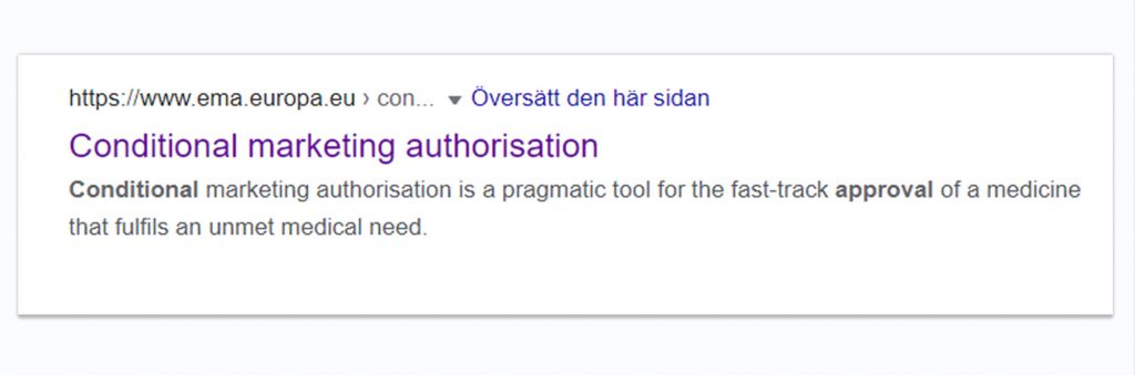 Och om du klickar på länken så har du hamnat på den myndighet som sköter om godkännanden av läkemedel i EU och kan läsa mer om hur villkorade godkännanden fungerar.