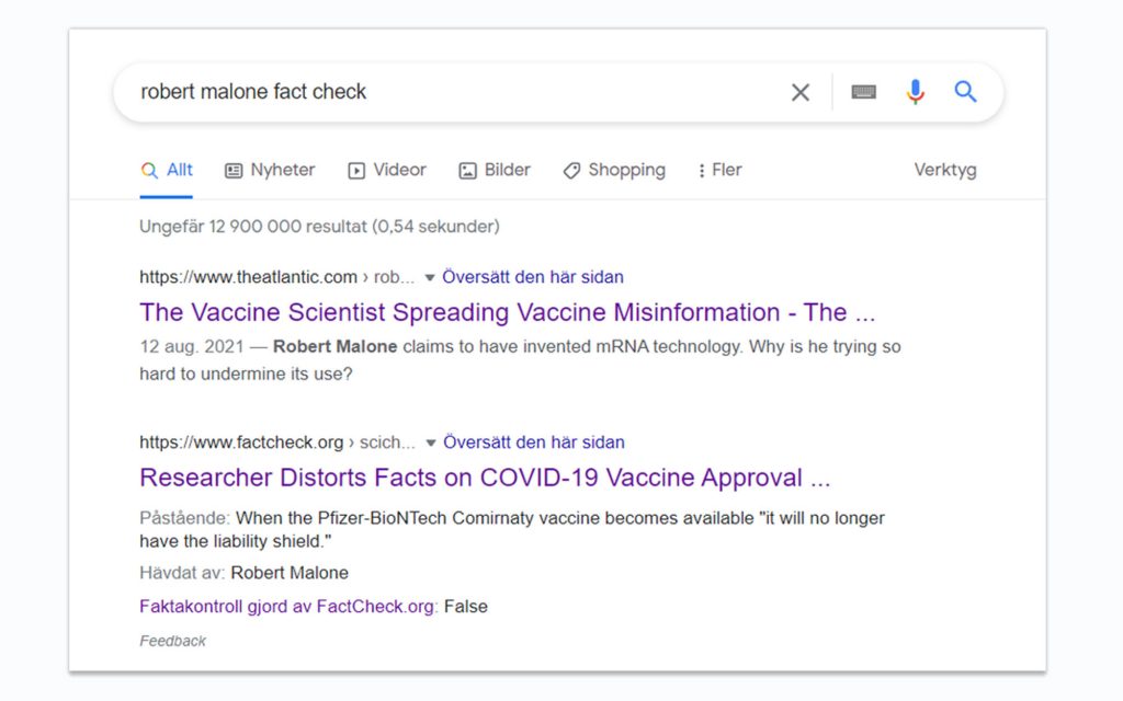 Så här gör du: Ta det viktigaste begreppet ur det du vill kolla och lägg till “fact check” i din sökning. Skriv till exempel “Robert Malone” och “fact check”. Sedan läser du igenom ett par av träffarna och hittar där mer bakgrund och ytterligare hänvisningar.