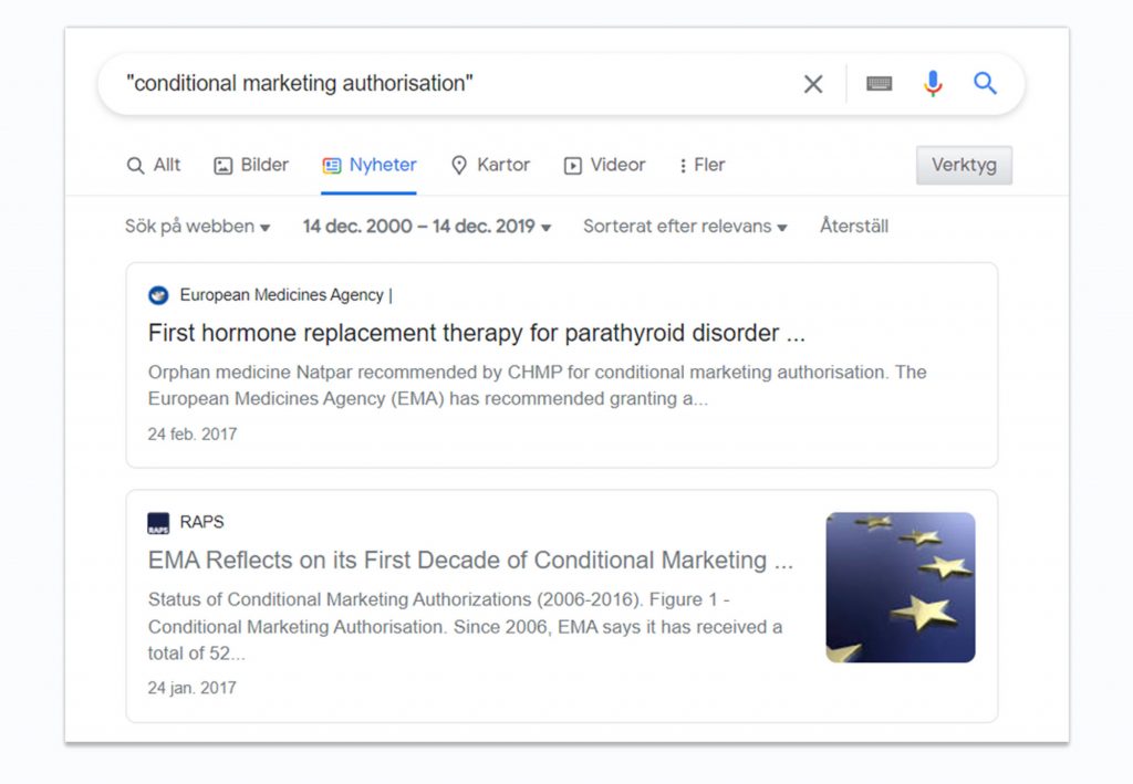 Du kan också välja fliken Nyheter här för att sortera ut de gånger som “conditional marketing authorisation” omnämnts i medier under den här tiden. Man får då upp till exempel en artikel från 2017 om en ny medicin för en kronisk sjukdom där villkorat godkännande använts.