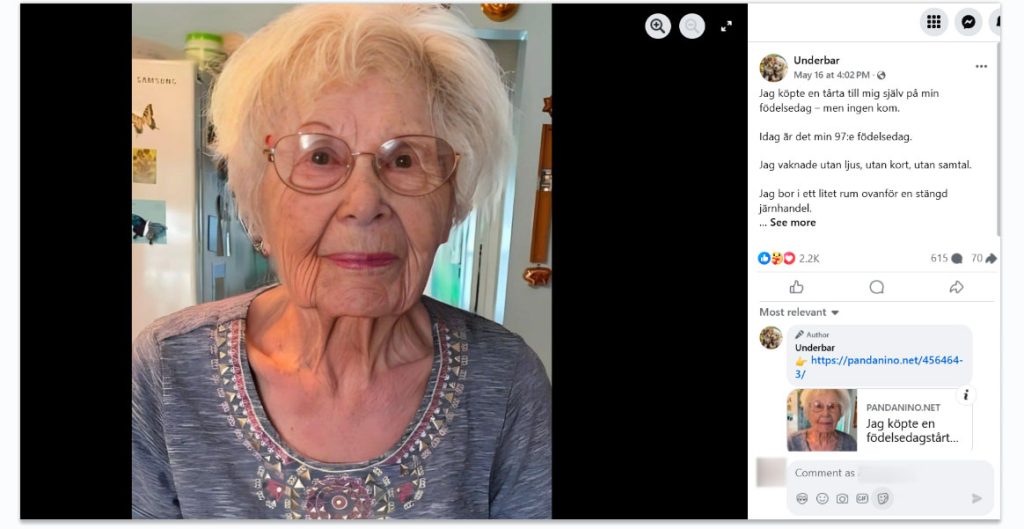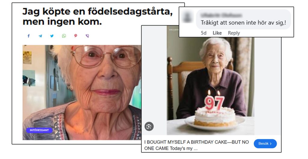 I fallet med damen och tårtan får vi minimalt med uppgifter. Vi får inte veta hennes namn eller var hon bor, bara att hon är 97 år. Det i sig är ett varningstecken. Den som vill skriva en historia som inte går att kolla utelämnar gärna detaljer som går att kontrollera.