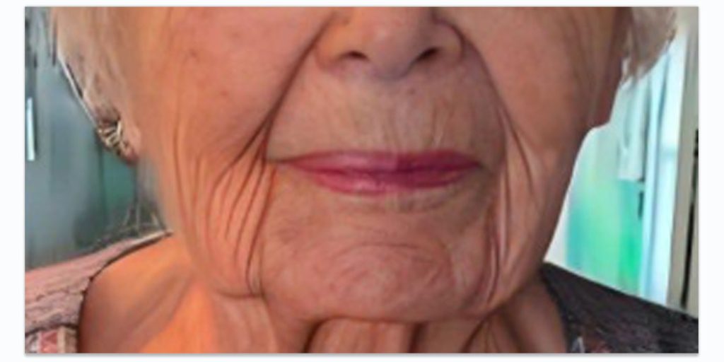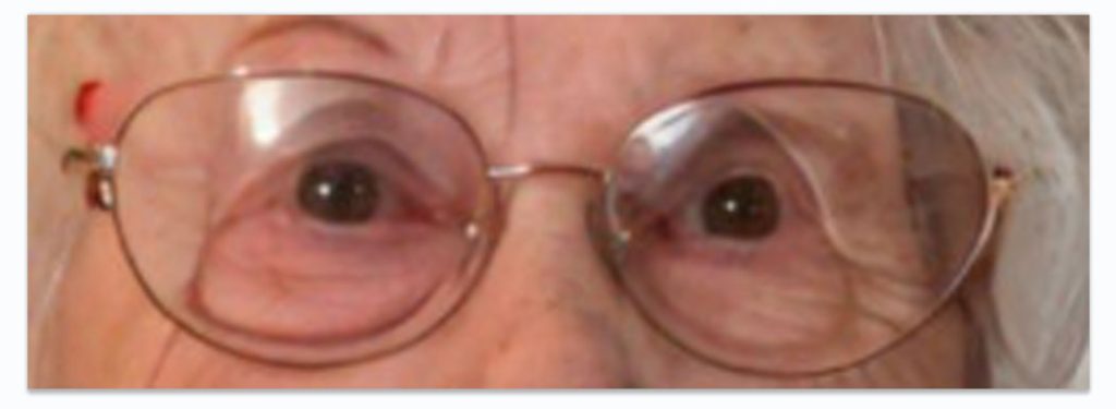I bilden på den 97-åriga damen kan man zooma in på ögonen och se att glaset i glasögonen ser ganska märkligt ut.