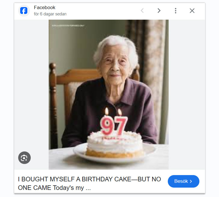 När man gjorde en omvänd bildsökning på bilden av den 97-åriga damen så dök den upp på andra sajter. Och eftersom vi misstänker att det är något skumt med den här historien så sökte vi helt enkelt på en beskrivning av den här bilden och historien. De exakta orden vi sökte på i det här fallet var “elderly bought cake but no one came”, men man kan testa sig fram.