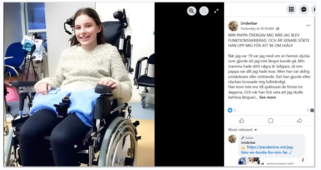 När det gäller sidan “Underbar” så startades den i somras och styrs från Armenien. Där publiceras olika sorters historier, ofta där det är synd om någon. Den här bilden delades i fredags med beskrivningen “MIN PAPPA ÖVERGAV MIG NÄR JAG BLEV FUNKTIONSVARIERAD”: