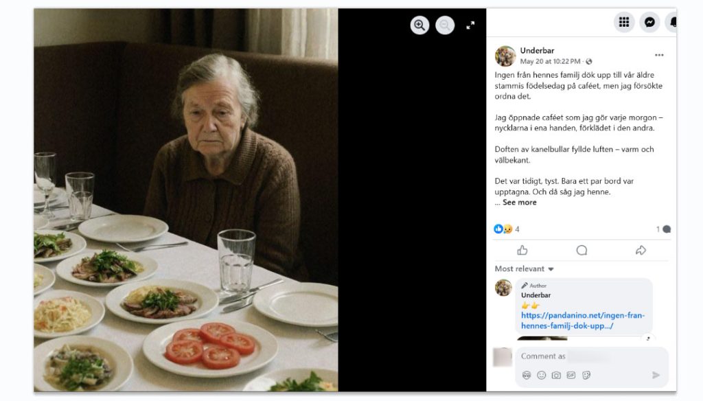 Facebook-sidan “Underbar” använder också flera varianter på samma sorts historia. “Ingen från hennes familj dök upp till vår äldre stammis födelsedag på caféet, men jag försökte ordna det”, börjar den här historien från 20 maj: