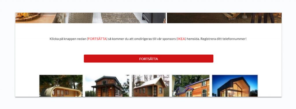 “Klicka på knappen nedan (FORTSÄTTA) så kommer du att omdirigeras till vår sponsors (IKEA) hemsida. Registrera ditt telefonnummer!”