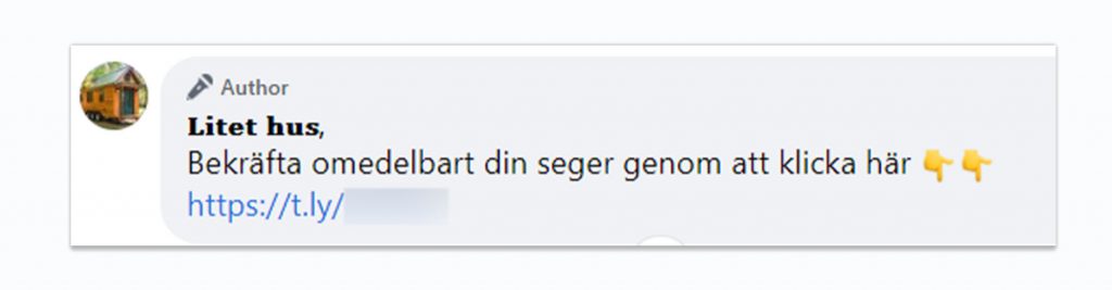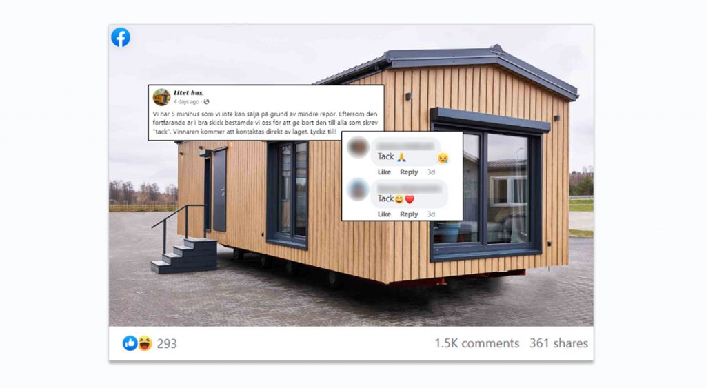 Bedragare har under de senaste veckorna startat ett stort antal Facebook-sidor som alla heter “Litet hus”. Från dessa skickas fejkade tävlingar ut där det påstås att du kan vinna minihus på hjul.