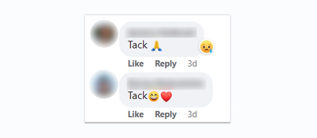 Människor skriver “Tack!” i kommentarsfältet och ger därmed spridning åt inlägget. Anledningen? Facebooks algoritmer tolkar interaktion, såsom gilla-tummar, delningar och kommentarer, som att inlägget är intressant och därför bör visas för ännu fler.