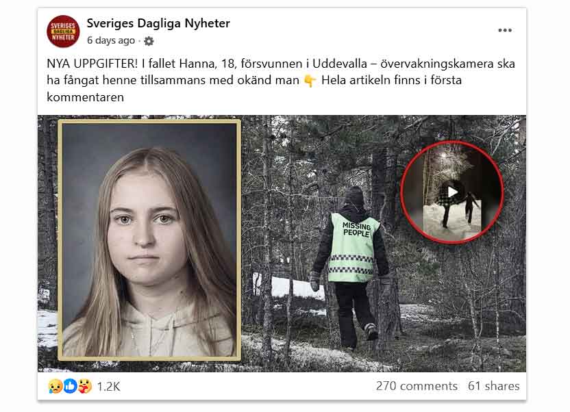 Två av dessa sidor har publicerat ett flertal klickbetesinlägg om sökandet efter Hanna. Det tycks dock främst handla om stulna artiklar från etablerade medier såsom TV4, Aftonbladet och Expressen. Det innebär att innehållet kan vara korrekt, fastän paketeringen är missvisande eller sensationslysten.