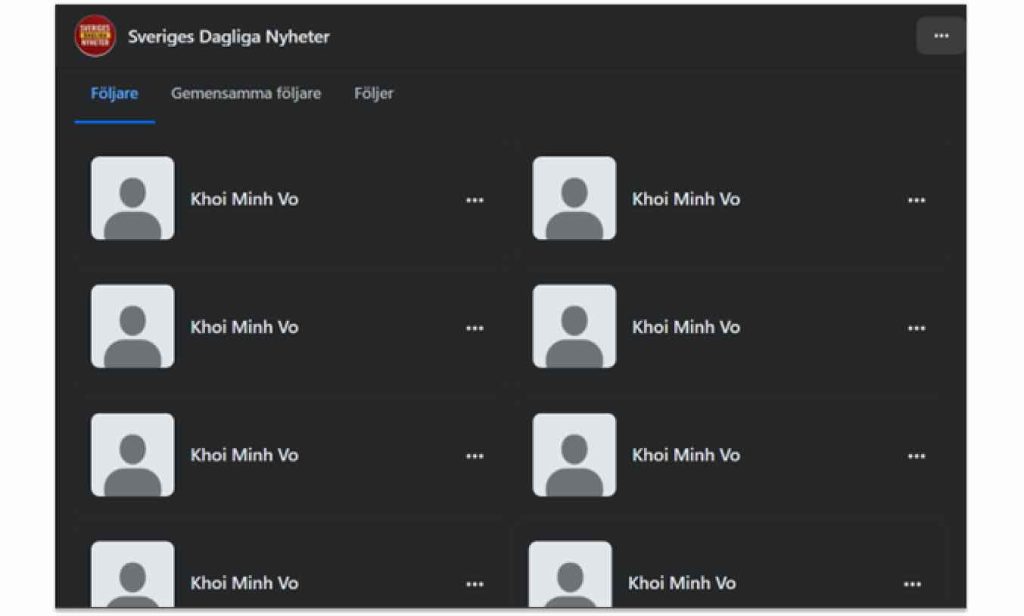 Sedan vår granskning i somras har dessa Facebook-sidor fortsatt sin aktivitet. Men den 27 november 2025 tycks något nytt ske. Då skapas sidan Sveriges Dagliga Nyheter, som ligger bakom inlägget om Hanna. Sidan får mycket snart 11 000 följare, varav merparten är “tomma konton” med vietnamesiska namn.