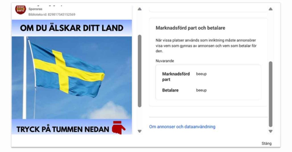 Att de fyra Facebook-sidorna ägs av klickfabriken Beeup går att styrka på flera vis. Sidorna har köpt sponsrade inlägg av Meta, och har då – på grund av EU:s regelverk – varit tvungna att uppge Beeup som marknadsförd och betalande part.