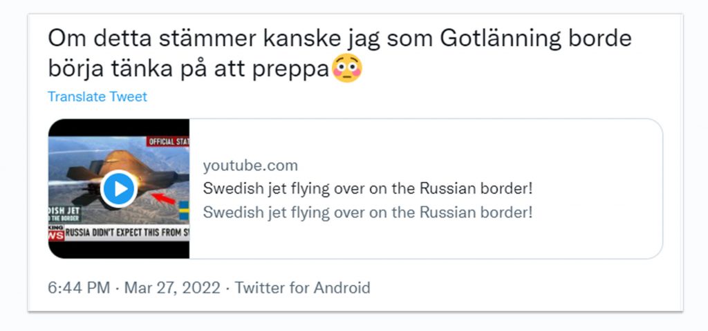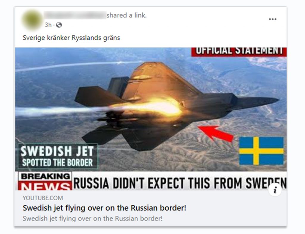I videon med rubriken “Swedish jet flying over on the Russian border!” görs också ett påstående att Sverige skänkt 500 miljoner kronor som stöd till Ukrainas väpnade styrkor.