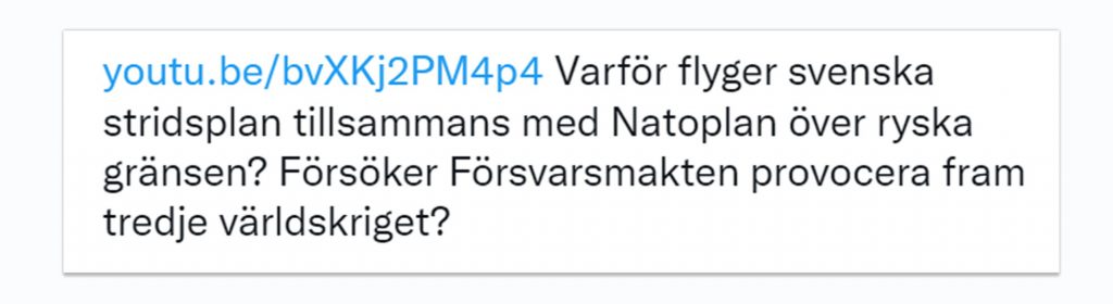 I Youtube-videon används just en skärmdump från det här Twitter-inlägget från i lördags. I den tråden visas hur ett svenskt Korpen-plan flugit från Linköping till Polen och sedan fram och tillbaka i polskt luftrum, men inte att planet skulle ha flugit över Ukraina, Belarus eller Ryssland.